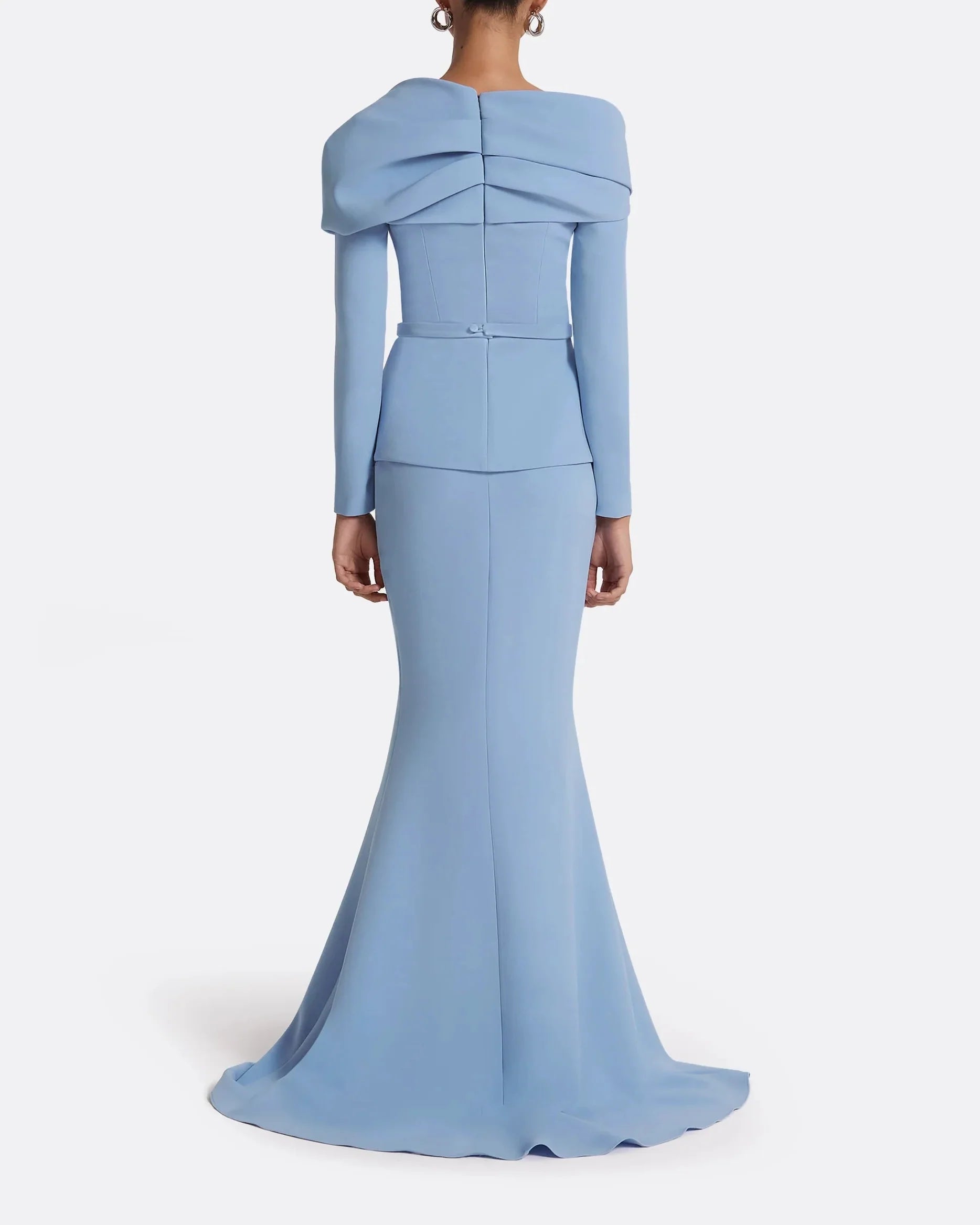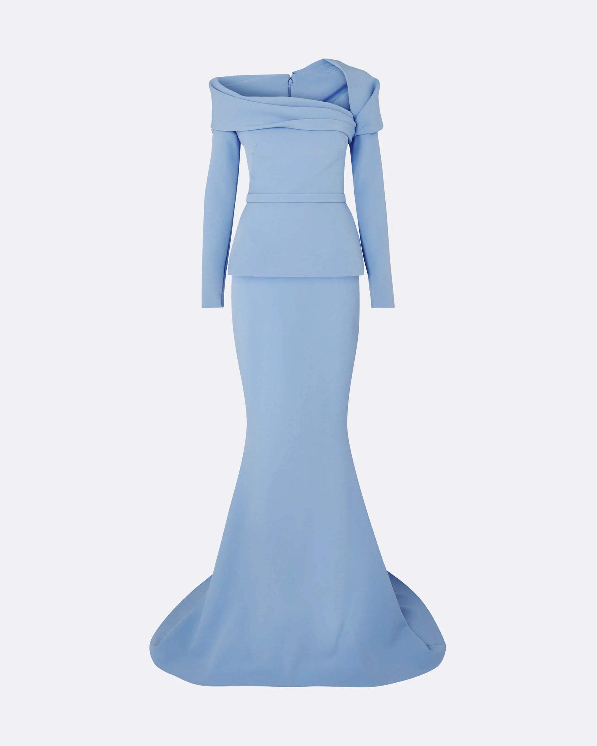 Elegant sky-blue gown featuring a sculpted off-shoulder draped neckline and tailored peplum waist for a refined silhouette. The floor-length mermaid skirt adds graceful movement, making it ideal for formal galas and upscale evenings.